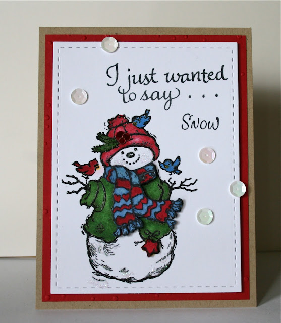 ReplyDeleteOh this little tree looks like ours from Ohio when the winter winds blow...brrr! It IS really cute though! And what a sweet snowman, I like the blue and red scarf best too! Delightful cards tonight Marybeth, great job...as always!!