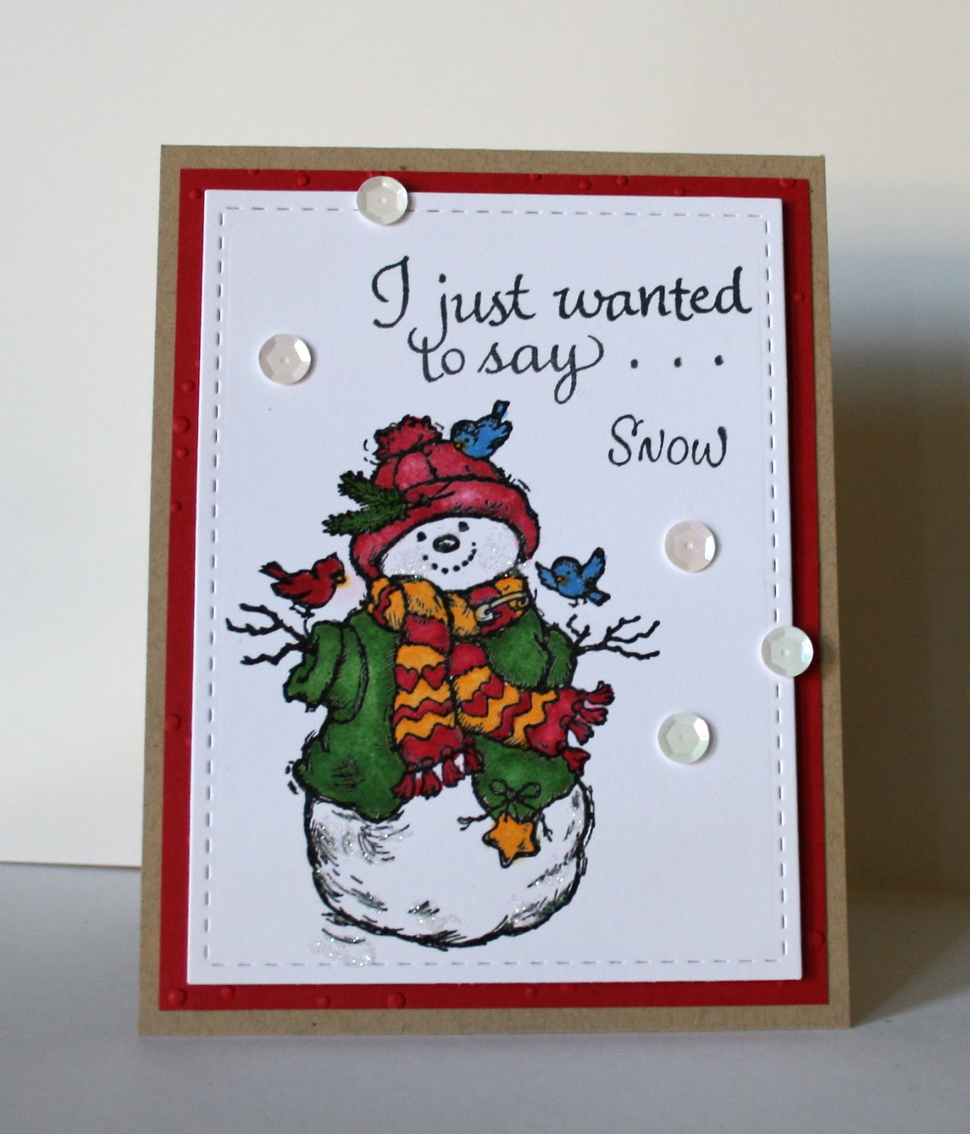 ReplyDeleteI liked the yellow and red scarf, that snowman looked cheerful. Oh this tree card is delightful, love that snow on the branches, so realistic. Also like how you placed all the saquins around on your cards.