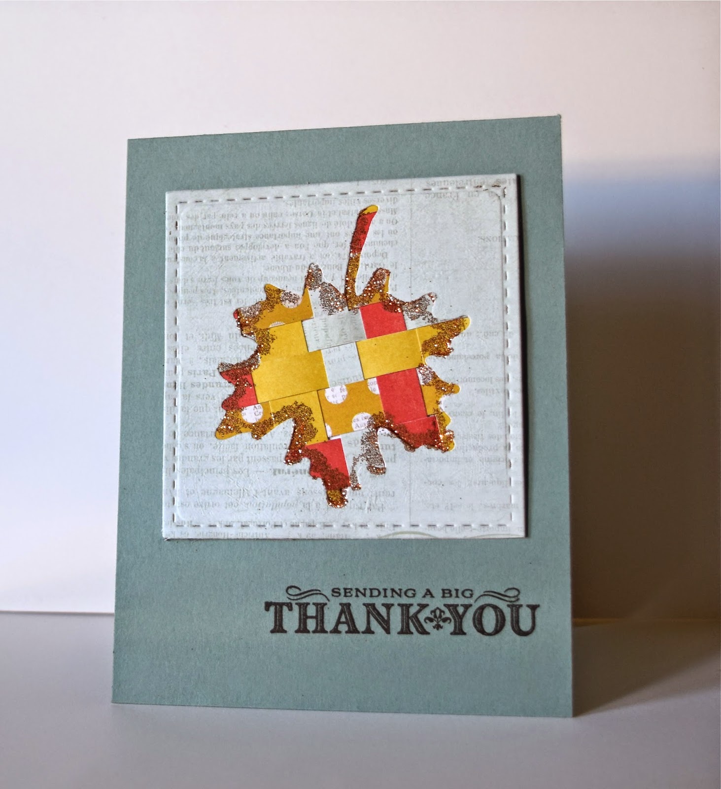 ReplyDeleteThe Thank You card is lovely too with it's Fall PP and stitched frame ~ no, I didn't see a glitter mess up, only a very artsy homemade card :-)