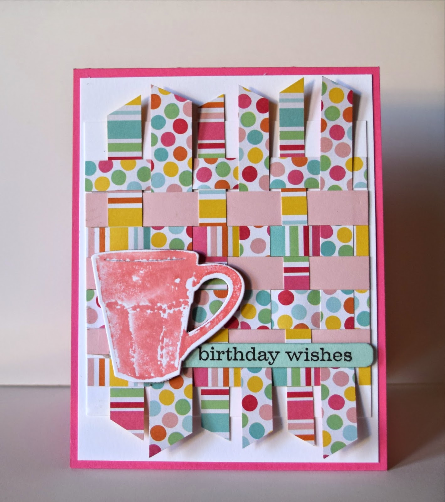 ReplyDeleteTwo great paper weaves, Marybeth. Love the coffee (or is it tea?) mug and the bright patterned papers... Fun B-Day card.