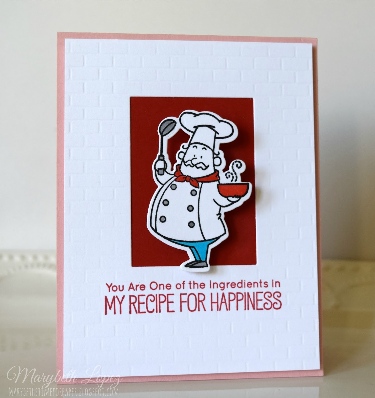 ReplyDeleteMarybeth...both of your cards are as sweet as can be. I love your sweet puppy and that chef is amazing! Thanks so much for playing along with us at ColourQ!